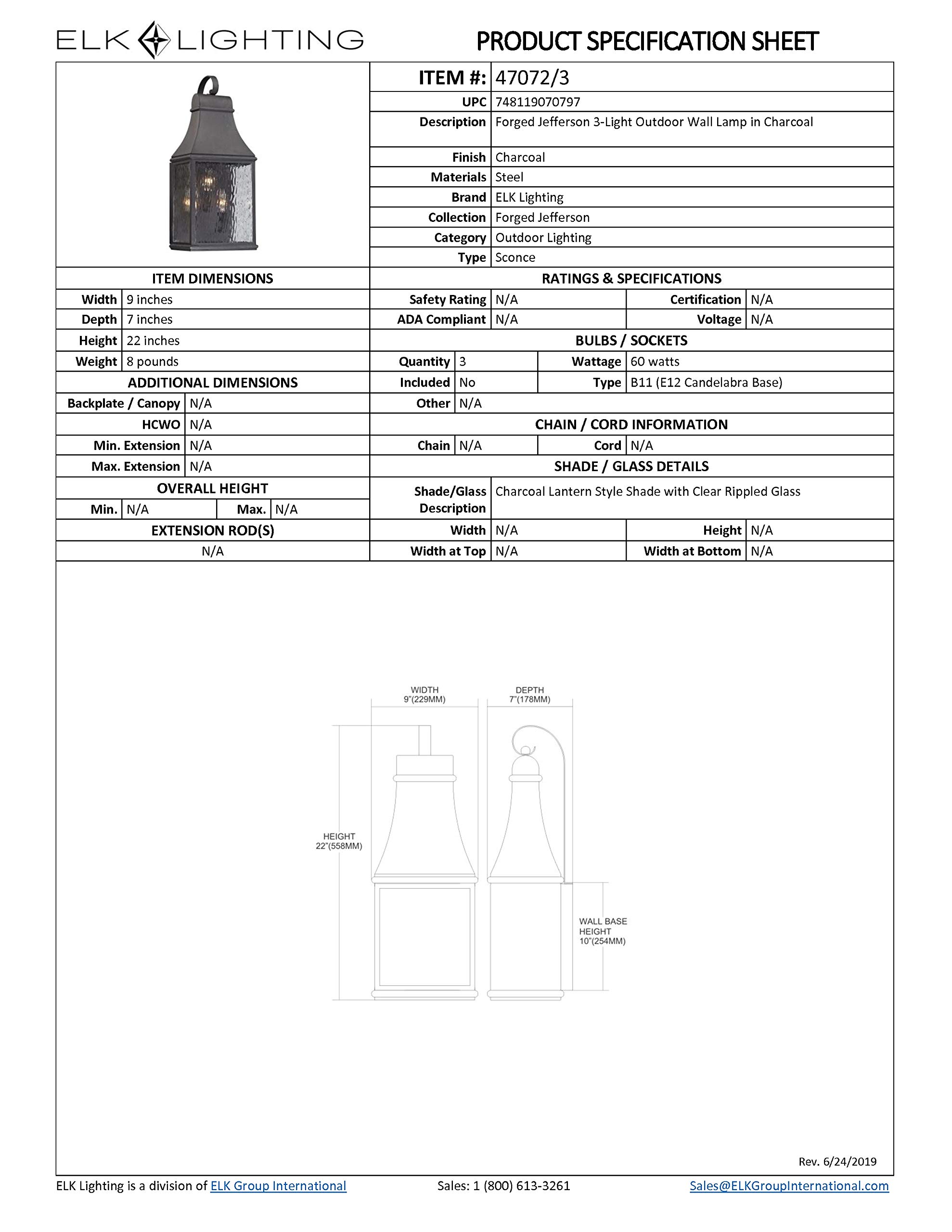 Elk Lighting 47072 3 Forged Jefferson Collection 3 Light Outdoor Sconce 22 X 9 X 7 Charcoal Amazon Com
